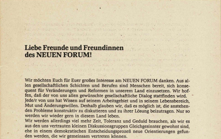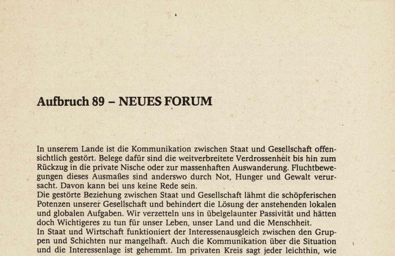 Aubruch '89 - NEUES FORUM In unserem Lande ist die Kommunikation zwischen Staat und Gesellschaft offensichtlich gestört. Belege dafür sind die weit verbreitete Verdrossenheit b …