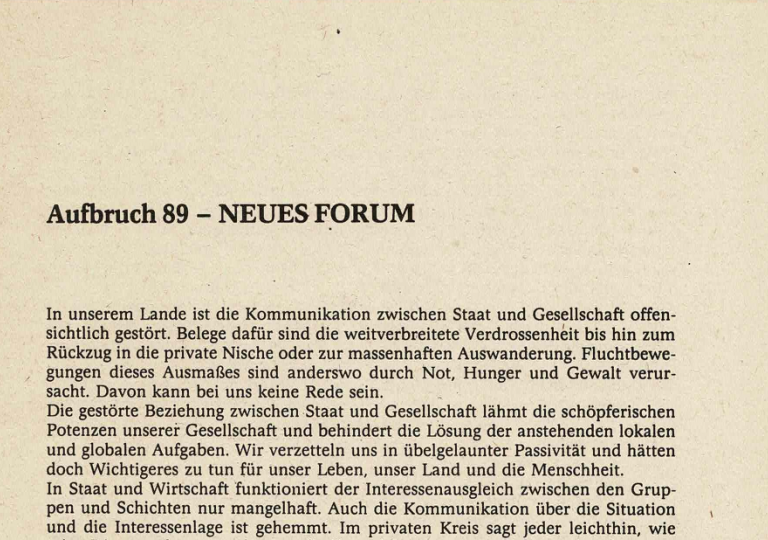09 September 1989 Aufbruch '89 - Neues Forum Aubruch '89 - NEUES FORUM In unserem Lande ist die Kommunikation zwischen Staat und Gesellschaft …