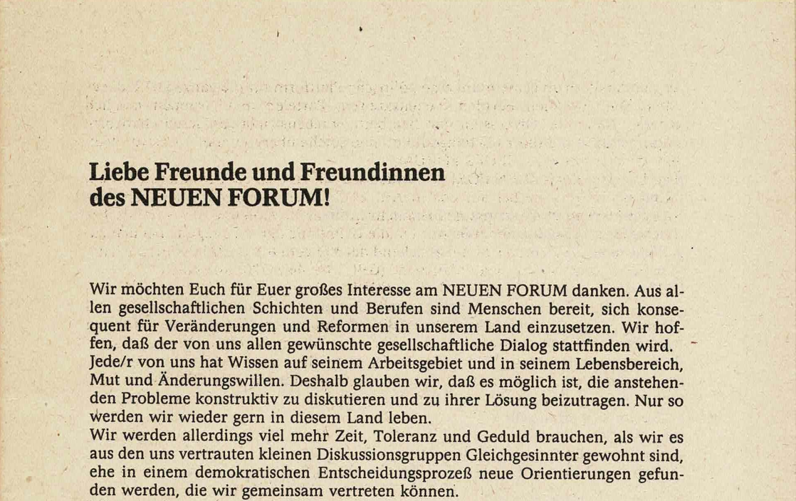 Wir möchten Euch für Eurer großes Interesse am "Neuen Forum" danken. Aus allen gesellschaftlichen Schichten und Berufen sind Menschen bereit, sich konsequent für Veränderungen und Reformen in unserem Land einzusetzen. Wir hoffen, dass der von uns allen gewünschte gesellschaftliche Dialog stattfinden wird.